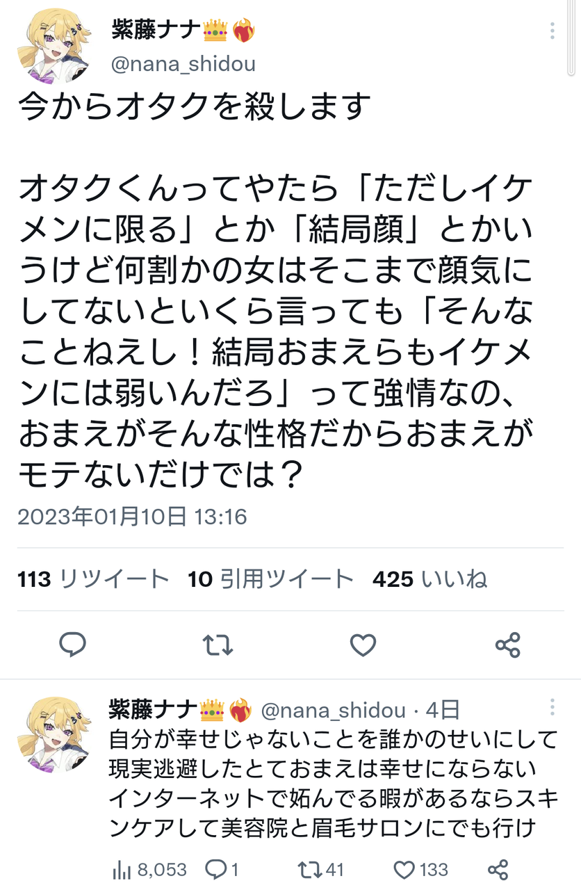 - オタク達が「ただしイケメンに限る」とか「結局顔」とかよく言うけど拗らせすぎ [2023/1/29]