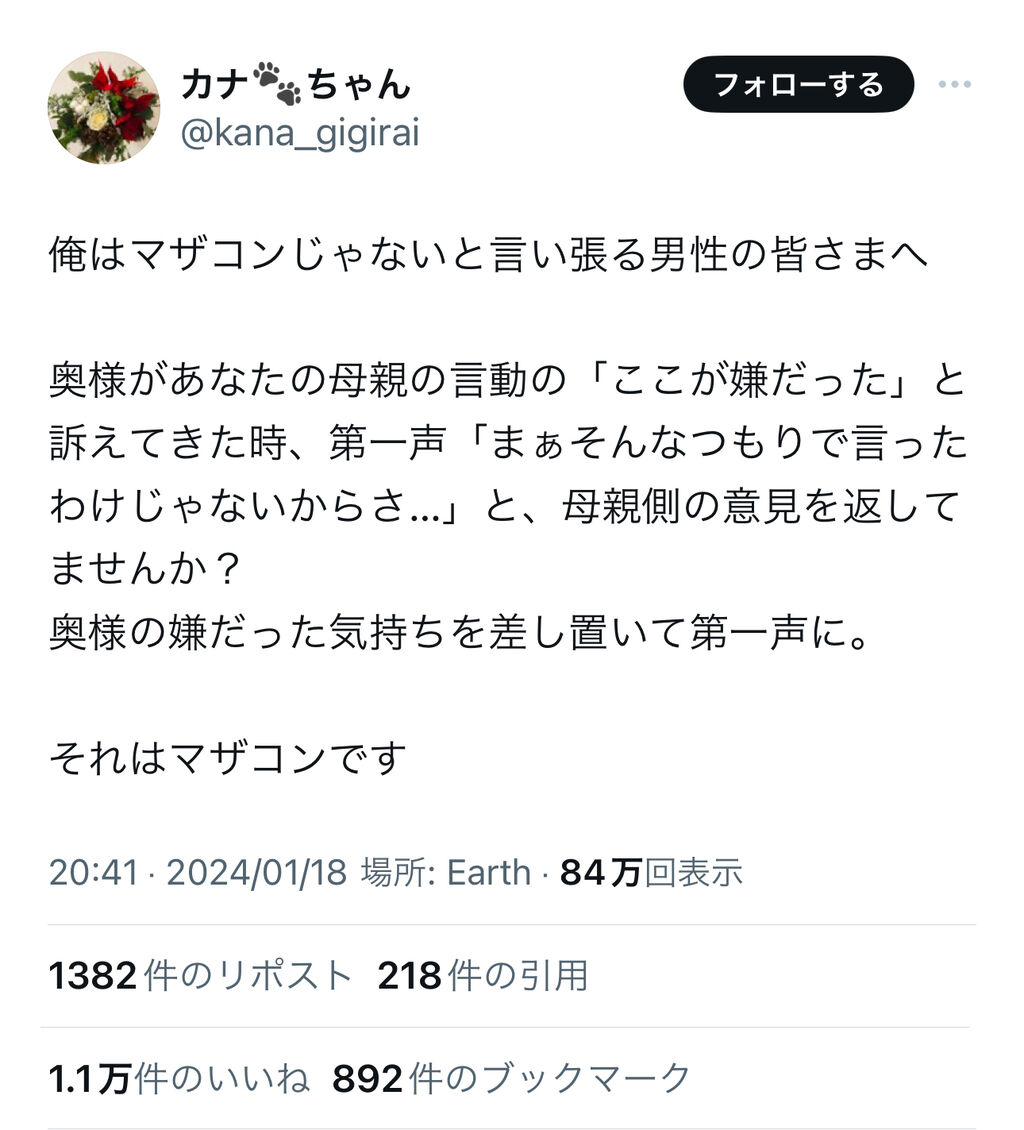 - 妻が義母について不満を言った時に母親側の肩を持って妻を宥めるような事を言う男はマザコン [2024/1/26]