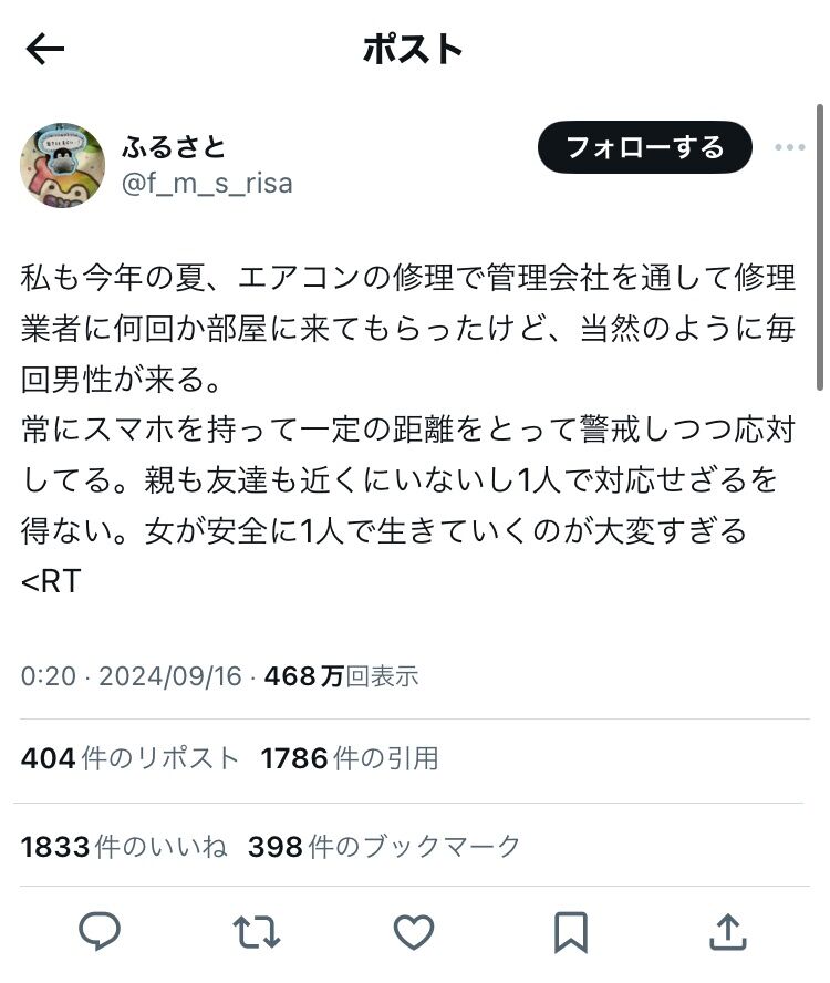 - エアコンの修理を頼んだら毎回男が来るの辛い。女が安全に1人で生きていくのって大変 [2024/9/21]