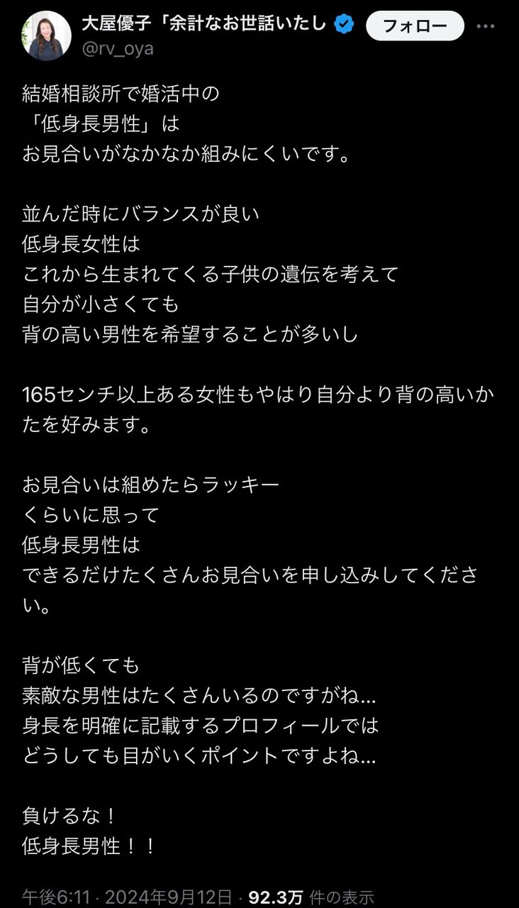 - 低身長男性はお見合いがなかなか組みにくい。できたらラッキーくらいに思って数いってほしい [2024/9/23]