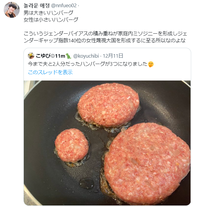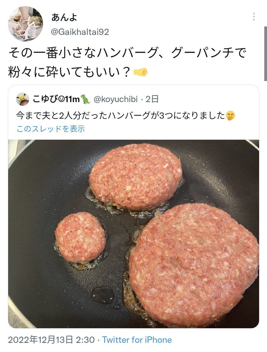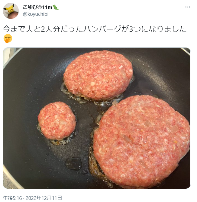 【画像】女子「今まで夫と2人分だったハンバーグが3つになりました♪」→炎上
