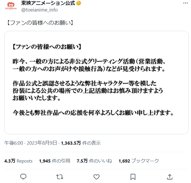 東映アニメーションのTwitterでも声明してるし固定ツイートにもなってる