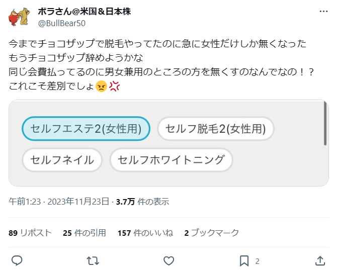 チョコザップ「お前、男?男は脱毛もエステも今は予約受け付けてないよw」