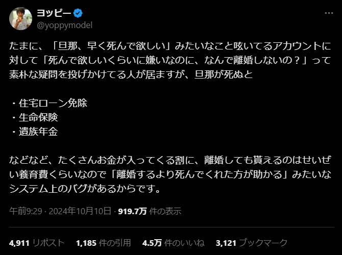 夫が亡くなったら得られるものってもそれは自然死やろ?アクティブに実行したらなんももらえないやん