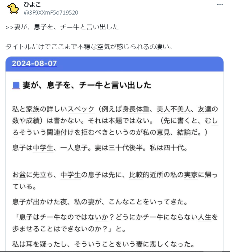 - 妻が息子の事をチー牛呼ばわりし始めて辛い。親が子供を指して使っていい言葉ではない [2024/8/21]
