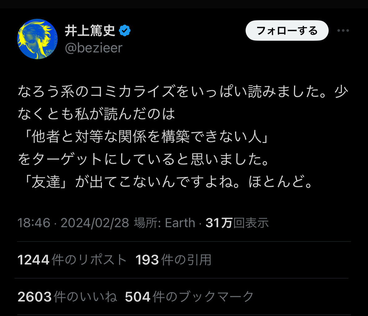 - なろう作品には対等な友達が出てこない。他人と対等な関係を構築できない人たちが読んでる [2024/3/8]